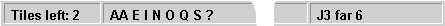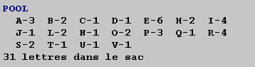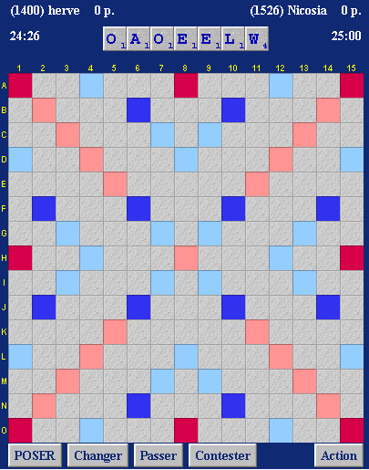 La grille de jeu est réinitialisée en début de partie. Pour chaque joueur, la cote (entre parenthèses), le pseudo, le score et le temps restant sont affichés. Le joueur qui commence est toujours situé à gauche et à ses lettres en bleu.