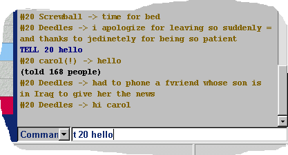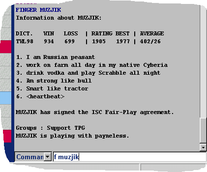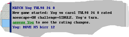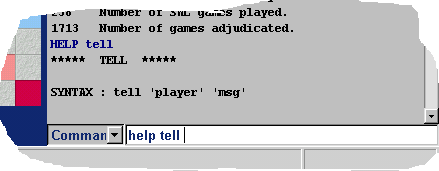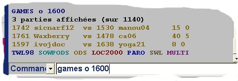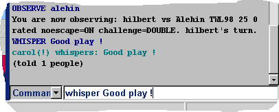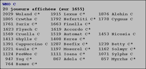 Il y a actuellement 28 joueurs ordinateurs, de différentes forces. Pour voir quels ordinateurs sont libres, tapez who C. Les ordinateurs ont un C (pour Computer) qui suit leur nom. S'ils n'ont pas de (*) vous pouvez commencer une partie en cliquant sur leur nom et en sélectionnant Match dans le menu qui apparaît. La partie commencera immédiatement avec le temps de jeu et les critères que vous lui aurez proposé.