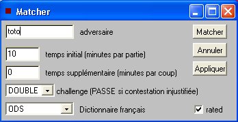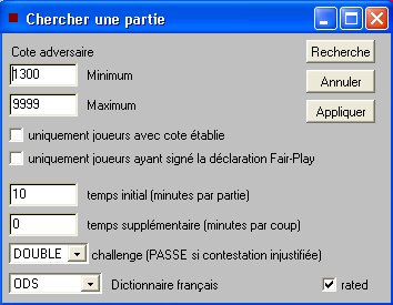La boîte de dialogue Chercher une partie permet d'indiquer un certain nombre de critères avant d'envoyer la proposition :