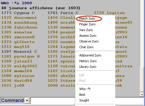 Au lieu d'envoyer une proposition de partie à tous les joueurs, vous pouvez demander à jouer avec un joueur en particulier grâce à la commande match. Pour matcher quelqu'un, faites un clic droit sur son nom et sélectionnez Match dans le menu contextuel ou sélectionnez Match dans le menu Partie.